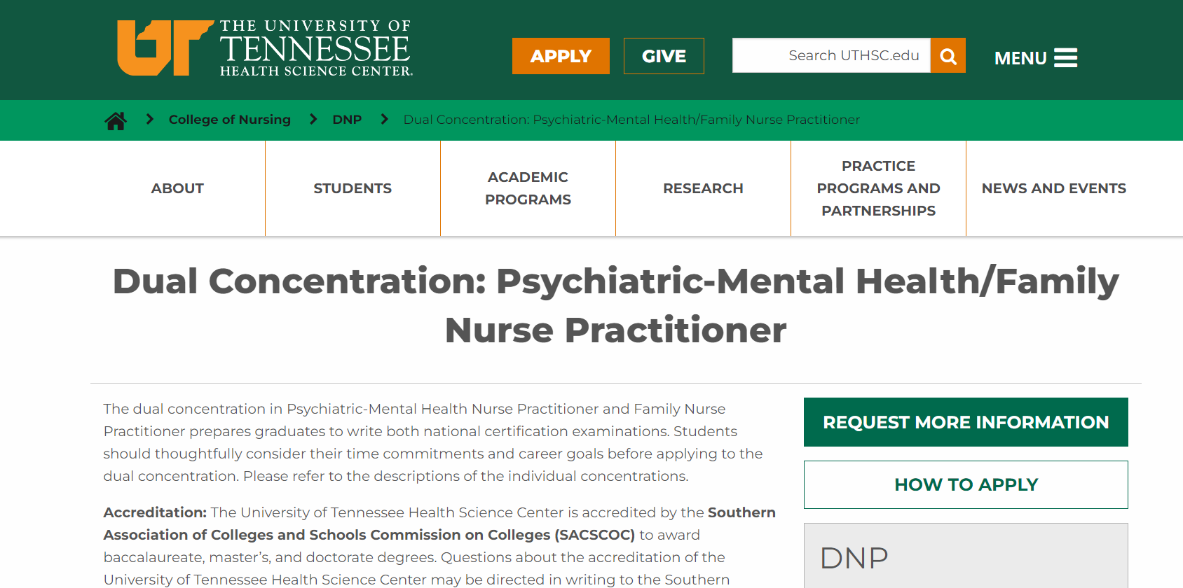 테네시 대학교 건강과학센터는 BSN에서 DNP로의 전환을 목표로 하는 학생들을 위한 FNP/PMHNP 이중 전공 프로그램을 제공합니다. 이 프로그램은 포스트-BSN 과정을 포함하여 가족 간호와 정신 건강 간호에 특화된 과정을 제공합니다. 프로그램은 73 학점과 1,140시간의 임상 실습을 요구합니다.